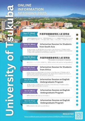 筑波大学では、海外で教育を受けた方を対象に、大学の概要や入試制度についてご案内するオンライン説明会を実施します。詳細につきましては、添付のチラシをご覧ください。